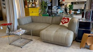 (pour information, le canapé QUILTON présent dans notre showroom a été réalisé selon la configuration N°19 composé de deux modules et recouvert du tissu Random, coloris Fade beige.)
