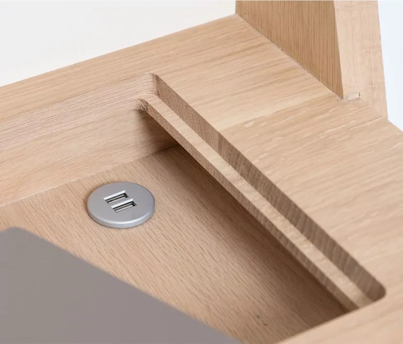 D’aspect sobre, il cache bien ses atouts : 2 trappes amovibles pour accéder à des espaces de rangement pour les portables, tablettes, crayons, papiers, un port USB pour recharger les batteries et une surface aimantée pour accrocher cartes et documents.