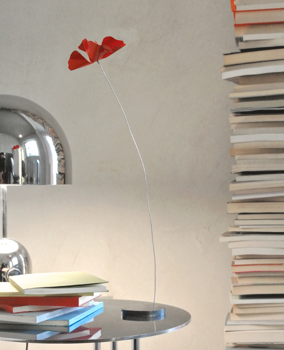 La Fleur de Table Papavero Delicato, légère, fragile mais en même temps stable et solide est la représentation que ces termes, habituellement antithétiques, peuvent coexister comme pour toutes les autres créations de Gherardo Frassa. Ces petites sculptures de fleurs en métal apparaissent ainsi comme des objets à la forme emblématique de la fleur avec des pétales en laitons ou acier délicatement pliés à la main et soutenus en toute légèreté, par un tige en acier robuste inoxydable reliée à sa base, aussi inoxydable. Ces fleurs seront donc éternelles et resteront intactes avec toute leur poésie.