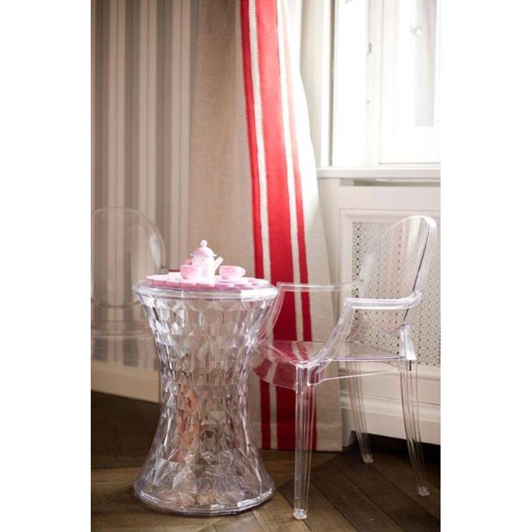 Stone est un tabouret aux formes très simples. Ligne épurée, linéaire et symétrique, sa surface est véritablement hors du commun : irrégulière, elle se compose de nombreuses facettes géométriques qui donnent lieu à un jeu de couleurs particulier et lui confèrent l’aspect d’un diamant. Il peut servir de meuble d’appoint, bout de canapé, mini table. Matériau : polycarbonate transparent ou teinté dans la masse.